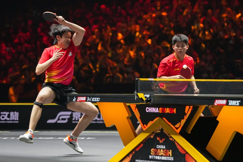 10月3日,王楚钦(左)/林诗栋在比赛中。\n 当日,在北京举行的2025年世界乒乓球职业大联盟(WTT)中国大满贯赛男子双打半决赛中,中国组合王楚钦/林诗栋3比1战胜另一对中国组合黄友政/温瑞博,晋级决赛。\n 新华社记者 鞠焕宗 摄